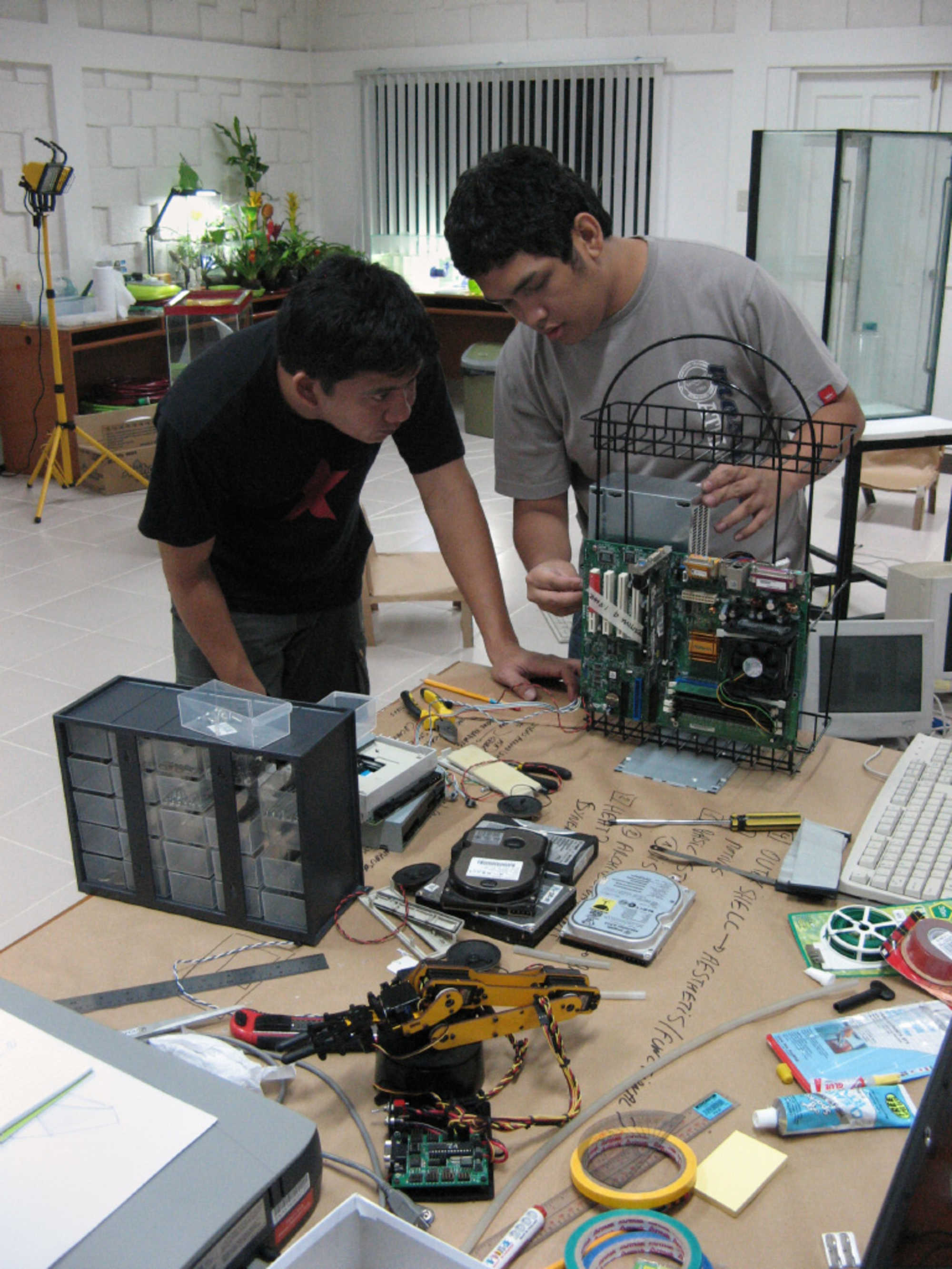 Since 2010 there's a new format for the Biomodd project: apart from building complex large-scale versions, there's also Biomodd Workshops in which people learn the basics of green case modding in a period of one to two weeks. Participants are led through an improvisatory process of creating functioning hybrid biological and digital sculptural forms that are consonant with the Biomodd conceptual framework, though on a smaller scale than the installations produced in Biomodd [ATH1] and Biomodd [LBA2]. Participants are introduced to the Biomodd conceptual framework and experiences from previous Biomodd workshops and projects. We show previous examples of systems that participants have built that integrate plant life and computer technology. We provide the participants with materials both taken locally and used in previous Biomodd workshops and projects.