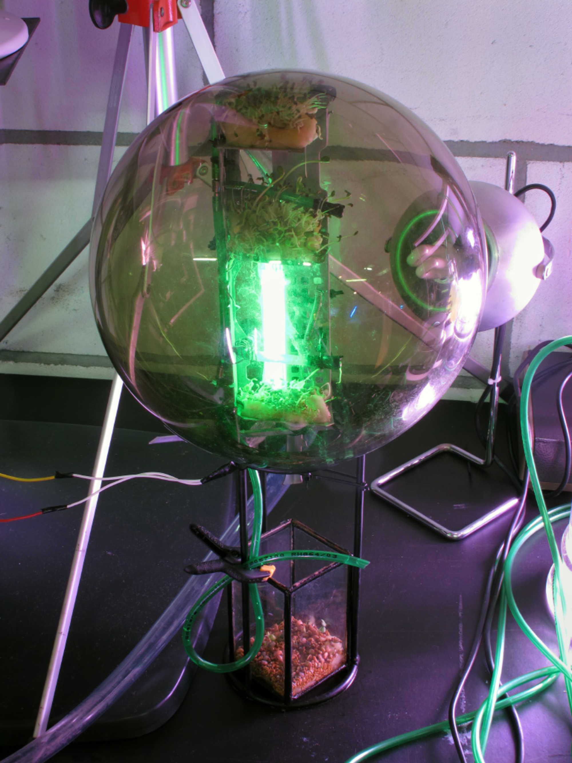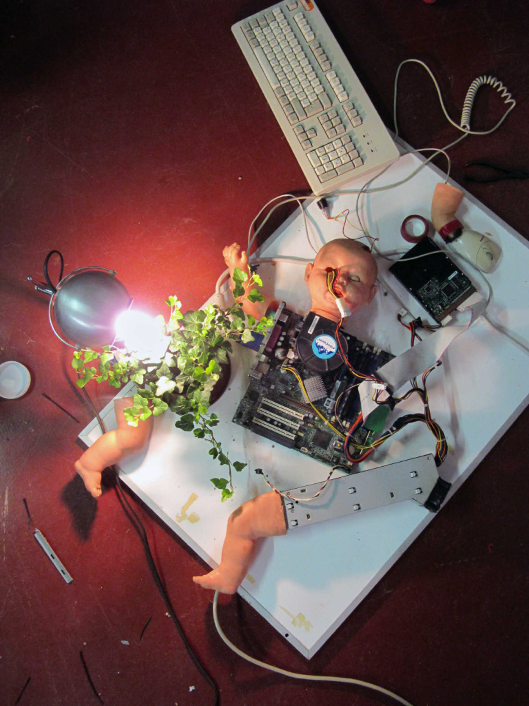 Generally the whole team showed a high level of dedication. Several things were explored that hadn’t been done before in the Ohio and Philippine Biomodd projects. We took the chance of trying out an open installation setup instead of working on one centralized monumental structure. This proved to be a good choice and worked out well for the final display during Coup de Ville. New open source games were researched leaving behind the games that were used in Biomodd before. And some of the assembled computer units were really innovative, both in their functionality and sculptural aesthetics. Pieter for example hacked a plastic doll, installed computer hardware inside, and connected the computer’s fans via tubing to a glass biosphere with sprouting seeds. A separate tubing system inside the biosphere was attached to a large syringe which was used to provide water to the seedlings.