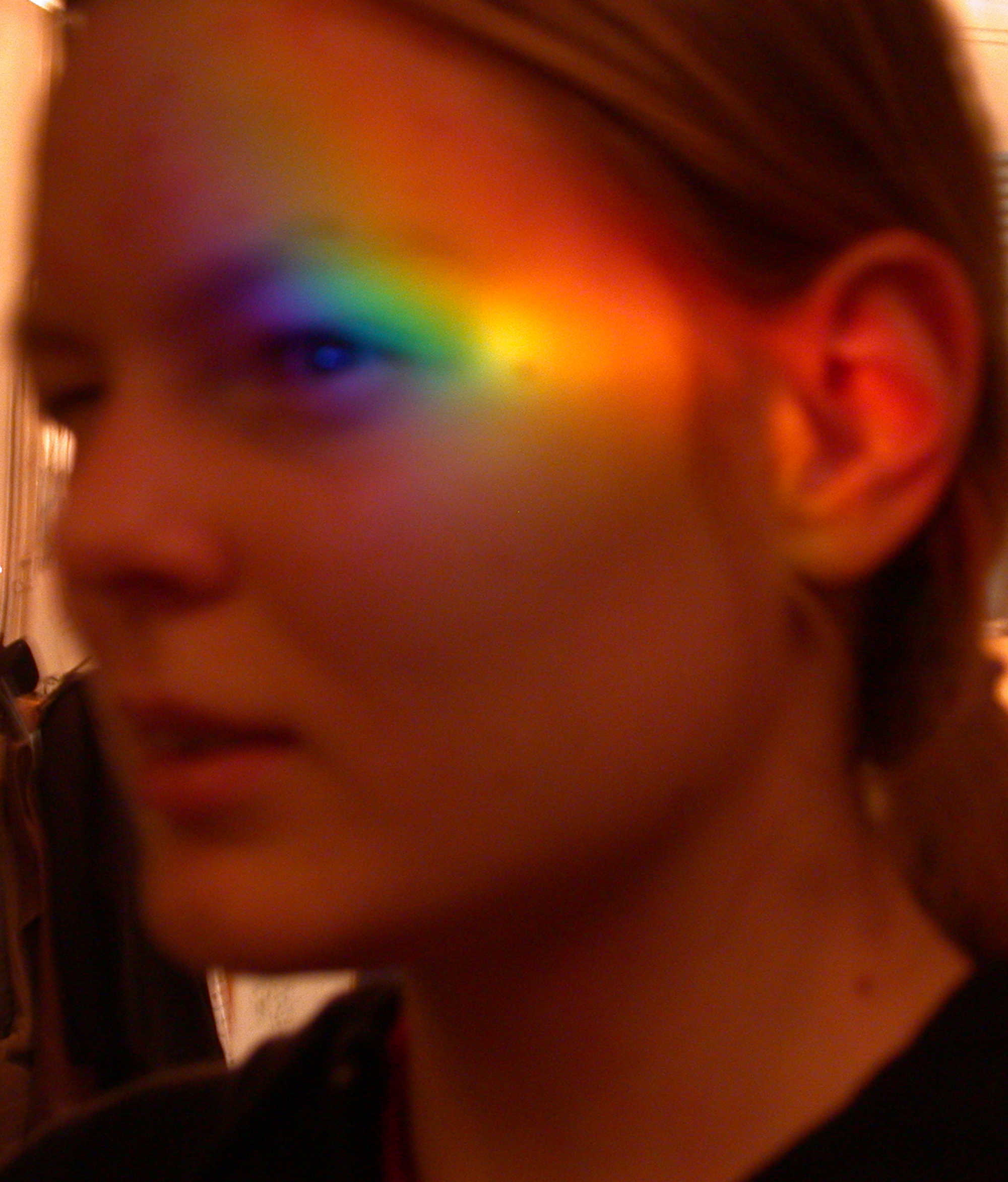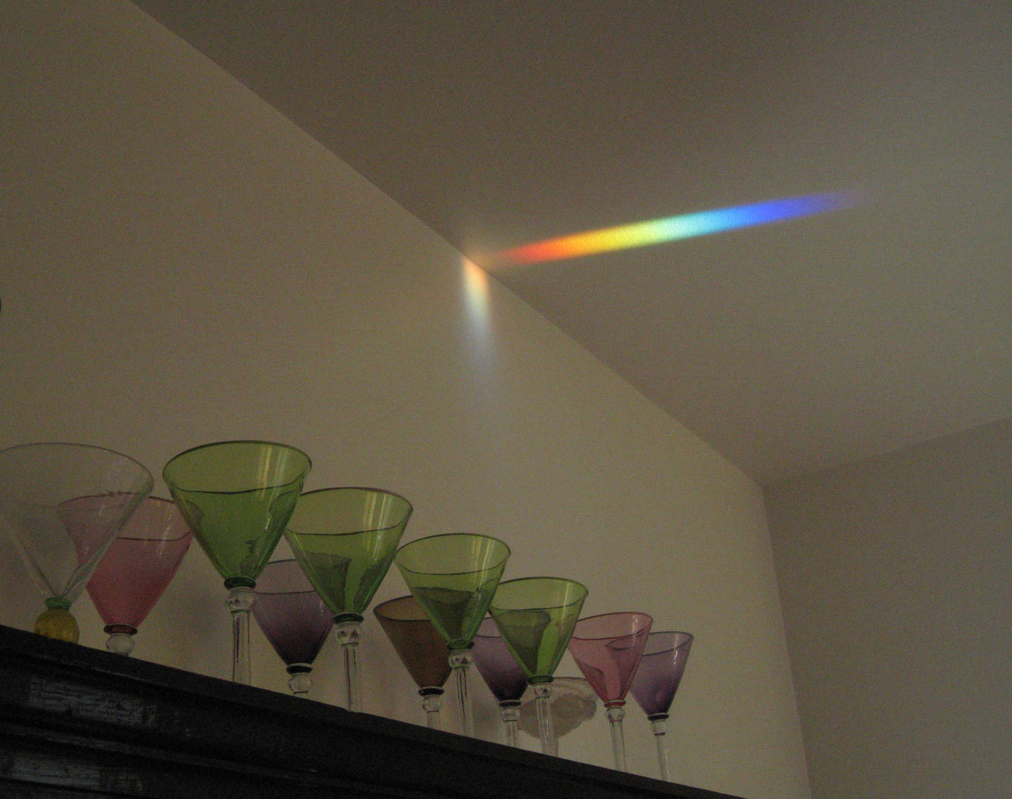 Light refracted by a cut and polished glass prism. Prism: 8x4x3cm. Spectrum on the wall: 80x20cm. The background wall is white in reality. The light is extremely bright. The camera overcompensates.