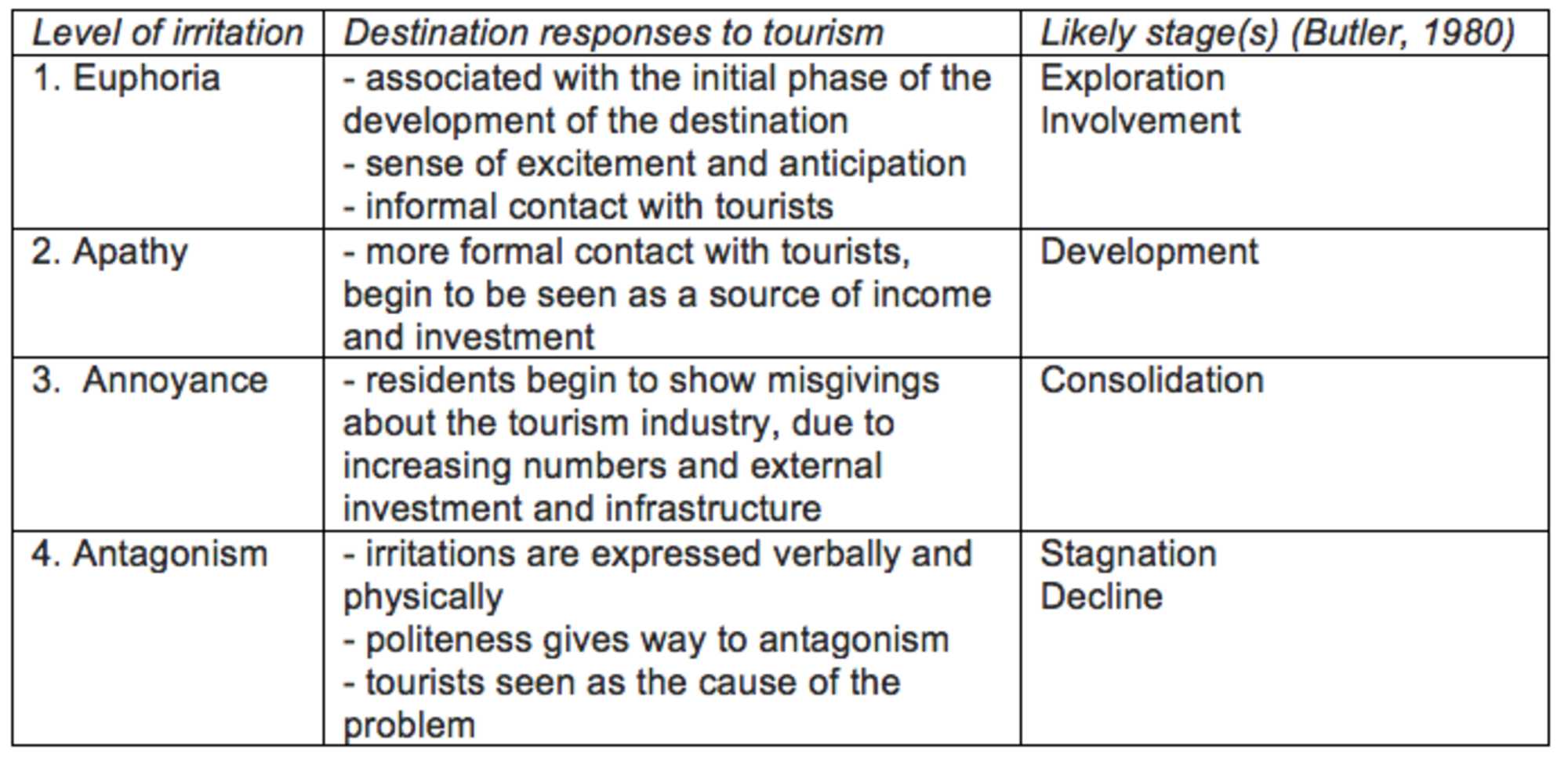 The host-guest relationship is one of the main factors that influence the social-cultural aspect of tourism. Tis relationship is very important in order to make sustainable transitions possible and establish relationship of trust. According to the Doxey's Irridex Model (Fig.1), suggests that: residentsâ attitudes toward tourism may pass through a series of stages from âeuphoria,â through âapathyâ and âirritationâ to âantagonismâ, as perceived costs exceed the expected benefits. This model can be related to the model proposed by Butler, where he explains the lifecycle tourism that leads or to decline or to rejuvenation. (Fig.2, 3)