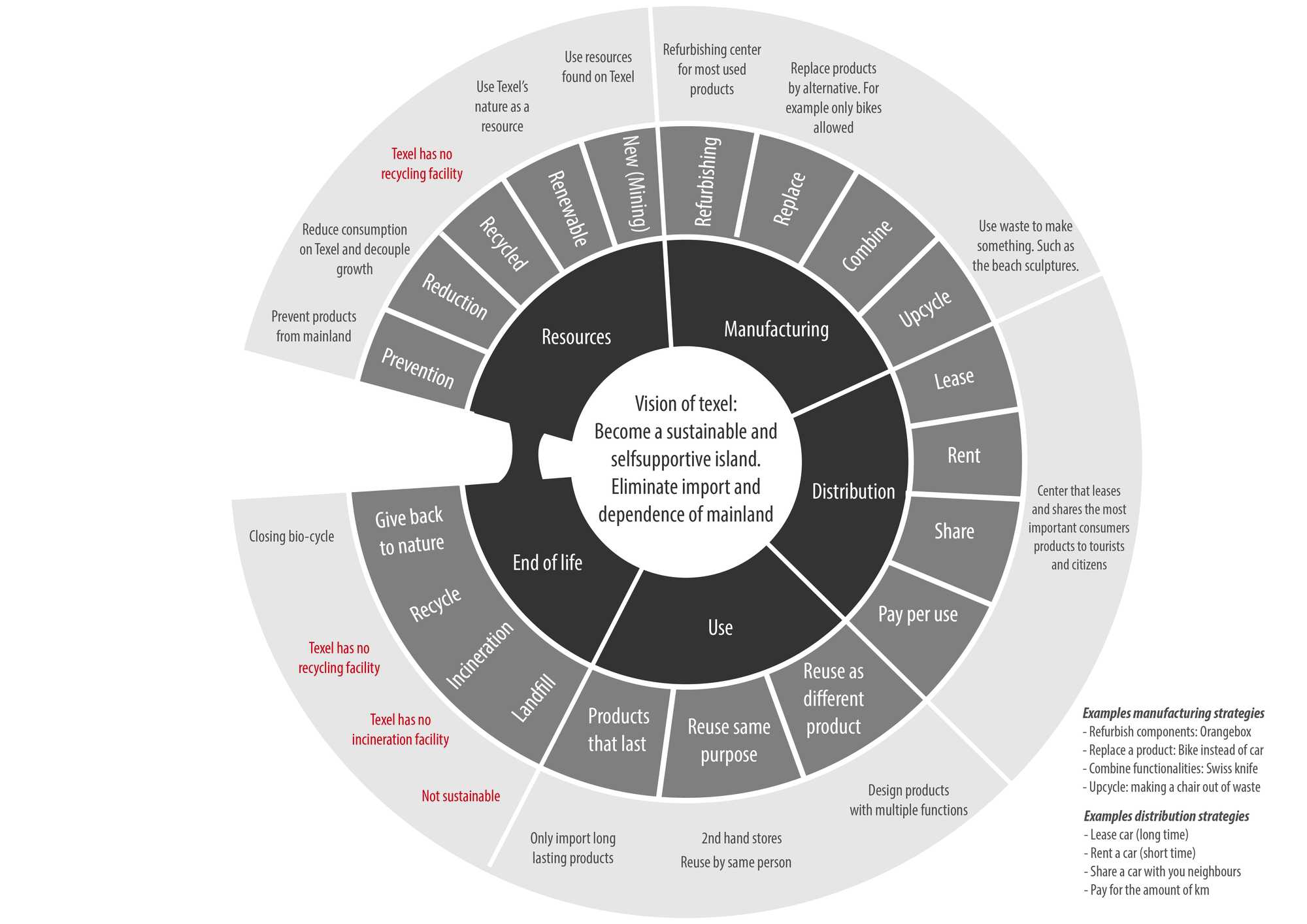 Material streams and waste is a big area where there are many different strategies and possiblities to handle material streams. The following image is preparedĀ for a brainstorm to select a more narrow research field by looking at which strategies are most suitable and promising to implement in a design for Texel. The figure is divided in life cycle stages. The earlier you select a strategy, probably the better. For example creating a product that last is better than only recycling, since you extend the lifespan meaning you can postpone energy use for manufacturing.