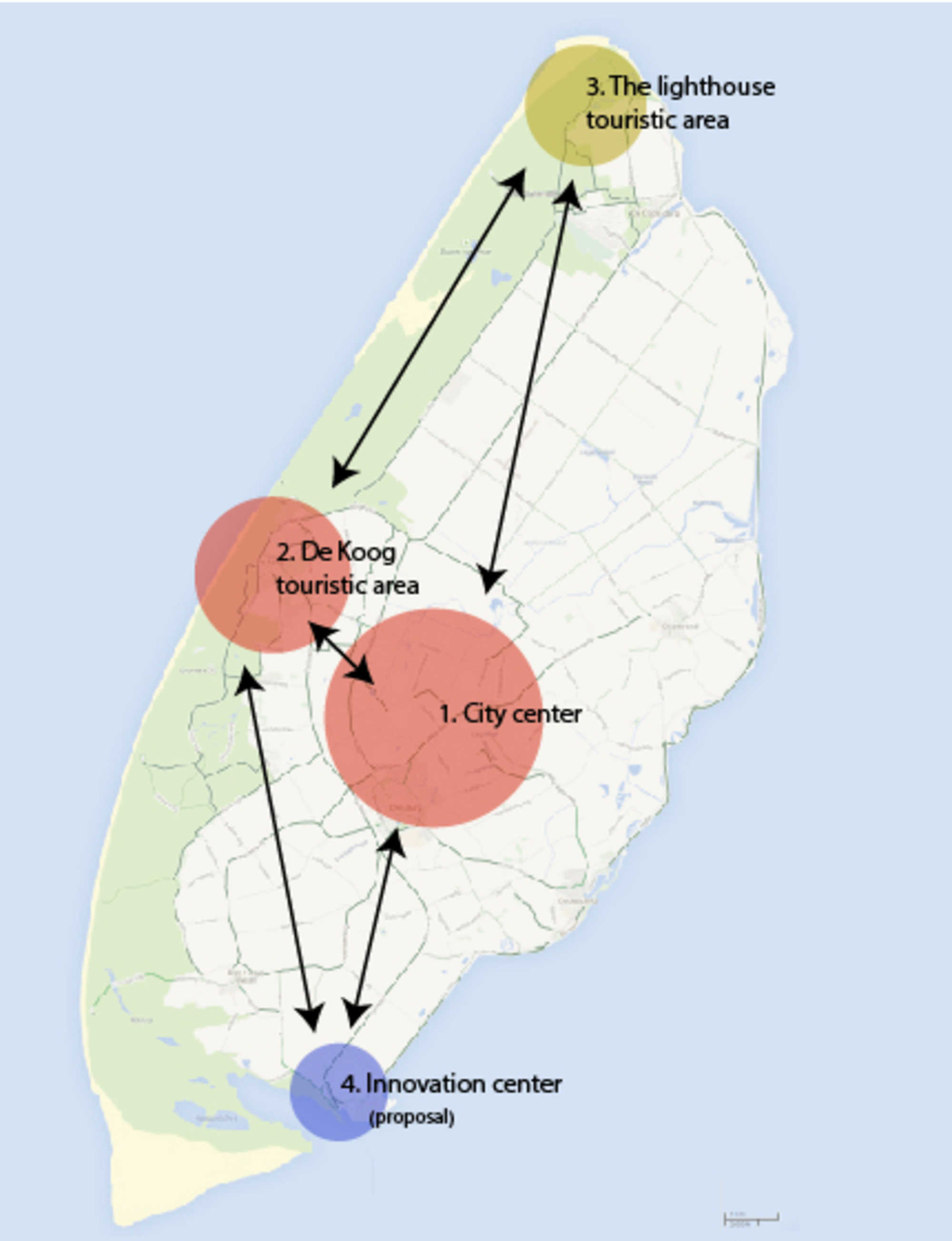 4. Nowadays, the island has three centers of interest; the city center, the touristic area of De Koog with the beaches and the lighthouse (see picture). Our main goal is to create a fourth center; the ‘Center of Innovation’, which will be of main importance for the economy and the character of the island.