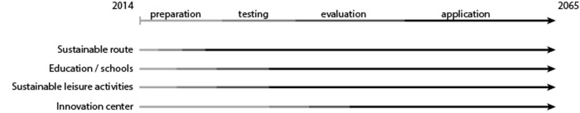 Last but not least, the time is very important when designing a strategy. As we can see from the picture below, the four actions are integrated in a unified program, where as we move from step 1 to 4, we need more time for programming, testing and evaluating. The sustainable route needs the least time and effort, while the creation of the center of innovation needs the most as it involves the design and construction of a whole building complex as well as its operational strategy.
